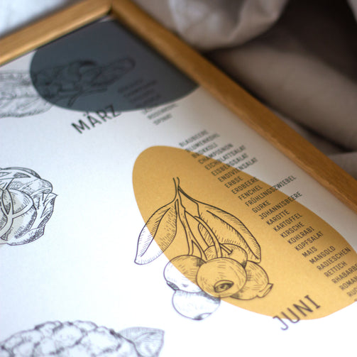 Die 12 schlicht und zugleich liebevoll illustrierten Gemüse- und Obstsorten, die moderne Farbgebung und die geradlinig gesetzte Typografie machen beide Saisonkalender zum Hingucker in jeder Küche. Das DIN A2 Hochformat entspricht dem gängigen Posterformat. Die Holzaufsteller-Variante findet auch in kleineren Küchen Platz.
