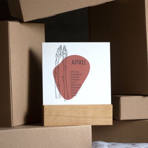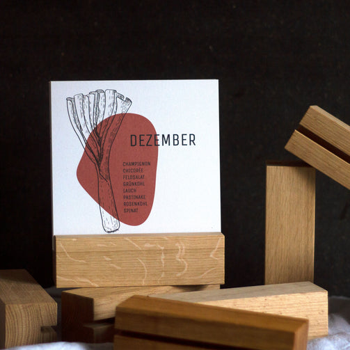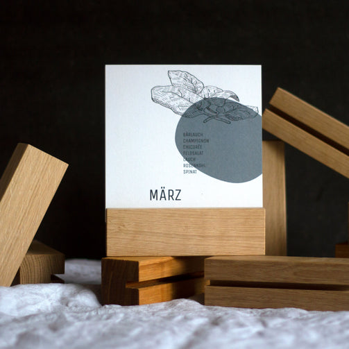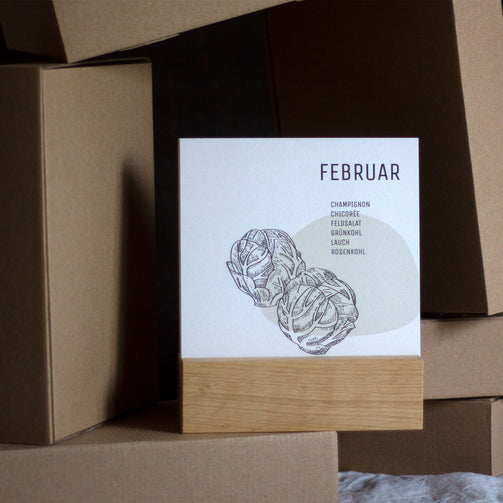 // Sicher verpackt: Der Holzsockel und die Monatskarten werden in recyceltem Seidenpapier eingeschlagen und in einer aus Recyclingpappe gefertigten Klappschachtel verschickt.