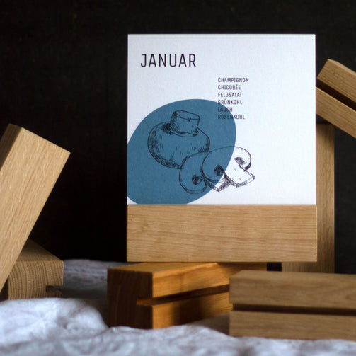 // Liebevolles Design: 12 modern illustrierte Gemüse- und Obstsorten, elegante Farbgebung und geradlinig gesetzte Typographie auf 12 Kalenderkarten verteilt.